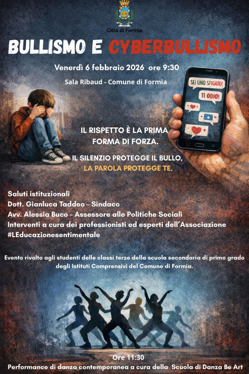 In occasione della Giornata nazionale contro il bullismo e il cyberbullismo, che si celebra il 7 febbraio, il Comune di Formia organizza un convegno dedicato in programma venerdì 6 febbraio, a partire dalle ore 9.30, presso la sala consiliare “E. Ribaud”.