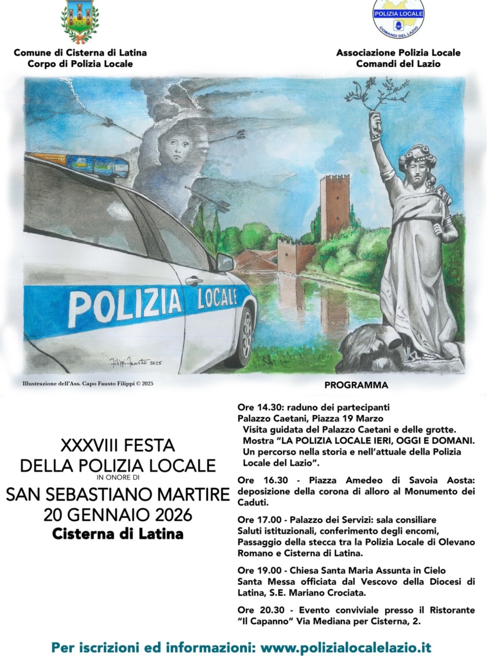 Cisterna di Latina si prepara a festeggiare, martedì 20 gennaio 2026, la ricorrenza di San Sebastiano Martire, patrono della Polizia Locale. Quest’edizione, la 38ima, assume un significato particolare, poiché il comune ospita le delegazioni dei Comandi del Lazio, oltre a rappresentanti delle autorità civili e militari.